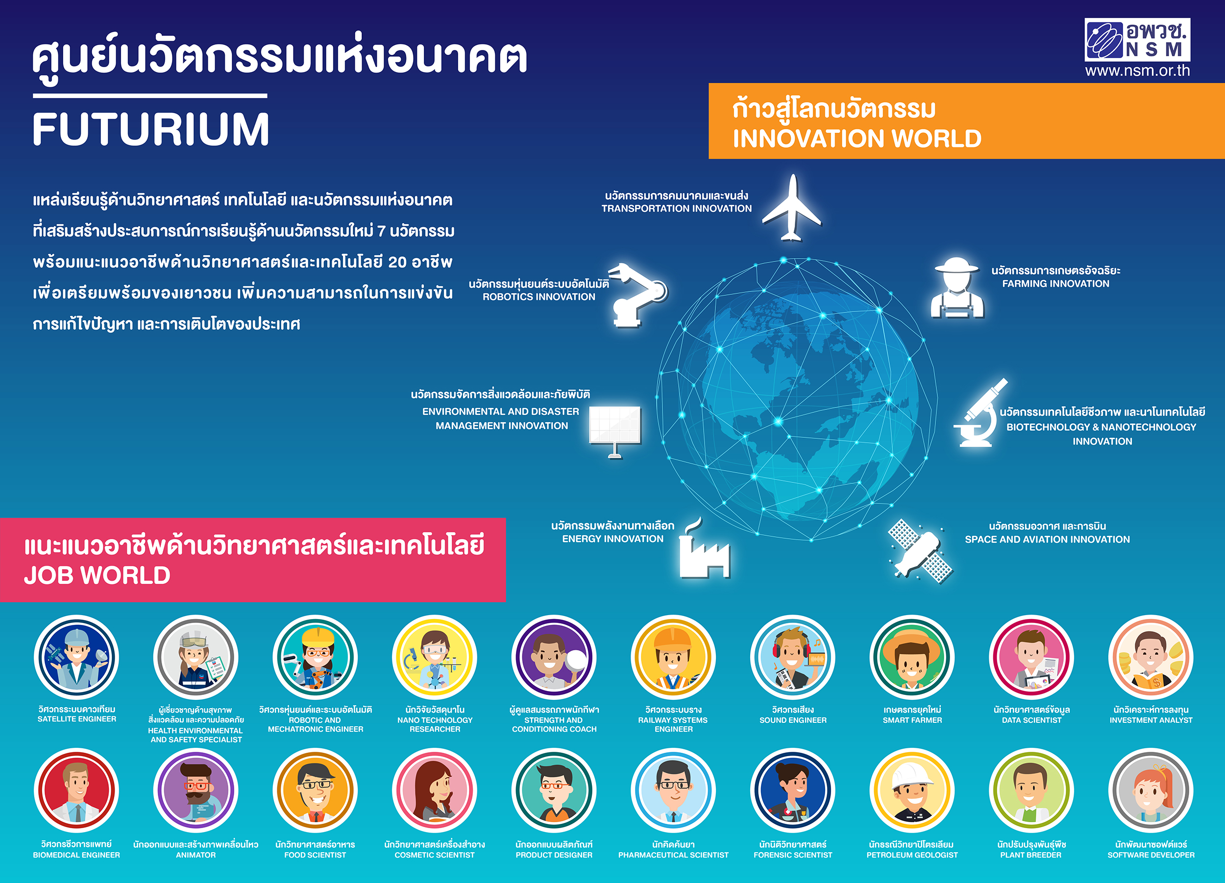 องค์การพิพิธภัณฑ์วิทยาศาสตร์แห่งชาติ (อพวช.) กระทรวงการอุดมศึกษา วิทยาศาสตร์วิจัยและ นวัตกรรม กําหนดพัฒนา โครงการ “ศูนย์นวัตกรรมแห่งอนาคต - FUTURIUM” ให้เป็นแหล่งการเรียนรู้ วิทยาศาสตร์ เทคโนโลยีและนวัตกรรมของไทยและของโลก ที่เหมาะสมกับผู้เข้าชมทุกเพศ ทุกระดับการศึกษา และทุกระดับอายุเป็นสถานที่แลกเปลี่ยนความรู้ด้านวิทยาศาสตร์ ประสบการณ์ด้านการวิจัยพัฒนาเทคโนโลยี และสร้างสรรค์นวัตกรรม กับบุคลากร นักวิจัย ผู้ประกอบการ หน่วยงานต่าง ๆ ทั้งภาครัฐและเอกชน เพื่อเป็น แหล่งในการ กระตุ้น สร้างแรงบันดาลใจ สร้างจิตวิทยาศาสตร์ ให้ความรู้ทางด้านวิทยาศาสตร์และเทคโนโลยี นําไปสู่การ ประยุกต์ สร้างสรรค์นวัตกรรม หรือสิ่งประดิษฐ์ใหม่ ๆ ให้กับประเทศ เป็นแหล่งให้ความรู้ ความ เข้าใจ และ ประสบการณ์แก่เยาวชน เกี่ยวกับอาชีพทางด้านวิทยาศาสตร์ เทคโนโลยีและนวัตกรรม เพื่อค้นพบ ตัวเองและ พิจารณาถึงการเลือกศึกษาต่อในระดับที่สูงขึ้น อีกทั้งยังเป็นสถานที่สําหรับการแสดงผลงานวิจัย พัฒนา ต้นแบบของนวัตกรรมต่าง ๆ เพื่อให้ภาคเอกชนหรือภาครัฐ นําไปประยุกต์ใช้ พัฒนาต่อยอด หรือนําสู่ การ ประกอบการเชิงธุรกิจต่อไป จนเกิดธุรกิจใหม่ ผู้ประกอบการรายใหม่ สร้างมูลค่าเพิ่ม ส่งผลดีต่อการพัฒนา เศรษฐกิจ สังคม การพาณิชย์ เพิ่มขีดความสามารถในการแข่งขันและการแก้ไขปัญหาให้กับประเทศในอนาคต โดยในการนําเสนอ มีการใช้เทคโนโลยีสมัยใหม่ เช่น สื่อการเรียนรู้แบบปฏิสัมพันธ์ (INTERACTIVE) สื่อประสม (MULTIMEDIA) โรงภาพยนตร์สี่มิติ (40) เทคโนโลยีการจําลองสถานการณ์ (SIMULATOR) และวัสดุอุเทศ (COLLECTIONS) ที่เป็นต้นแบบของเทคโนโลยีต่าง ๆ ที่เกี่ยวข้อง เพื่อให้ผู้ชมได้เรียนรู้อย่างสนุกสนาน เข้าใจ และ ได้รับประสบการณ์เรียนรู้อย่างเป็นระบบด้วยความเป็นเหตุเป็นผลอย่างแท้จริง