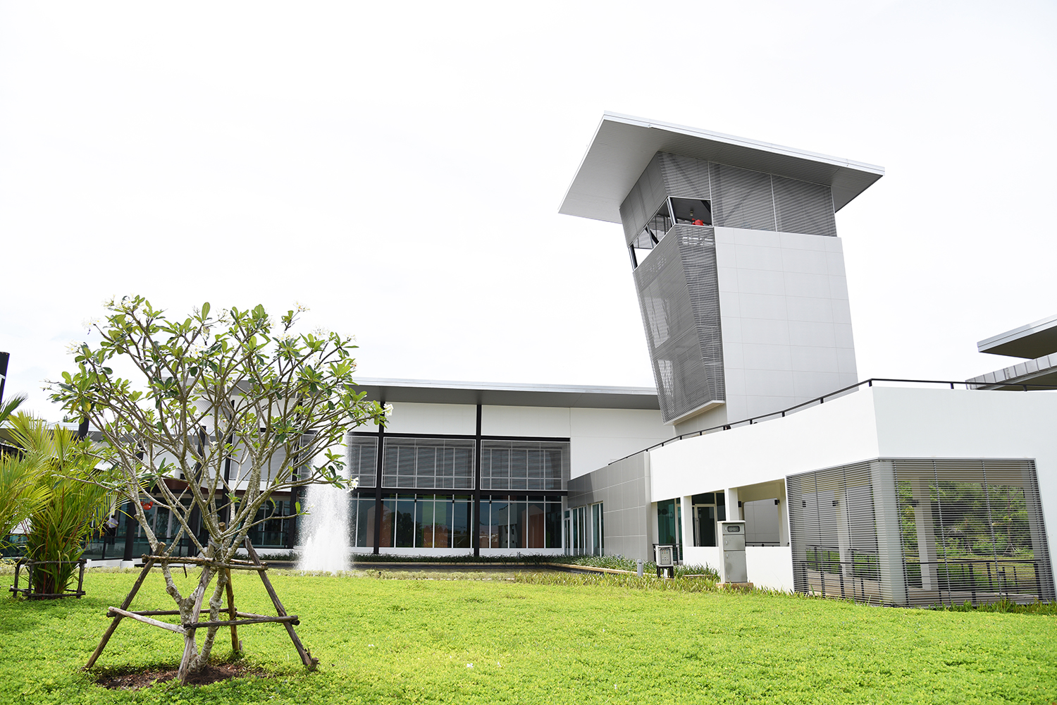 - ชมบรรยากาศของหมู่บ้านพลังงานแสงอาทิตย์ทับสะแกในมุมสูง ผ่านกล้องส่องทางไกล ณ จุดชมวิวชั้น 5